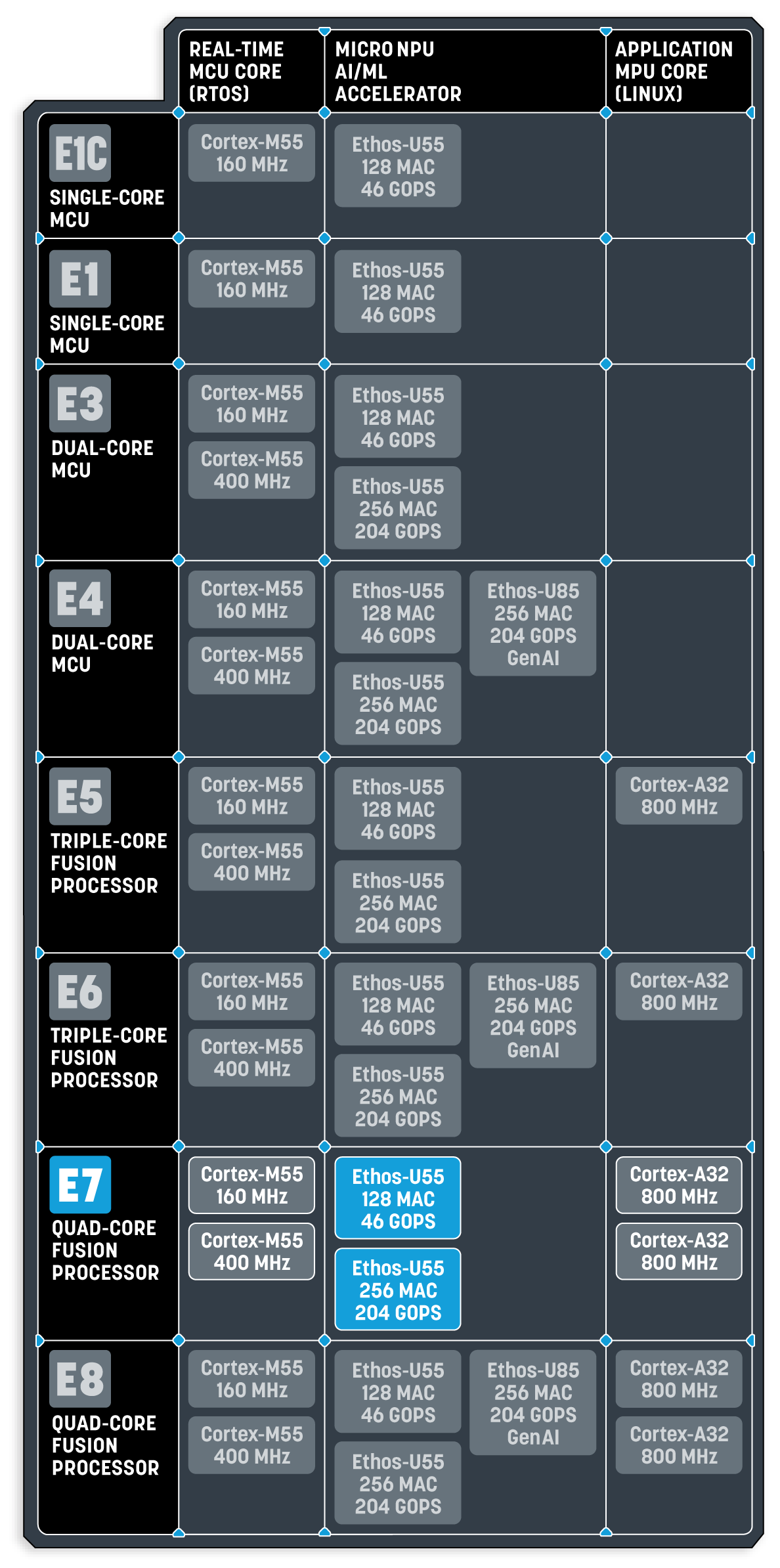 The Ensemble E7 is the ultimate fusion processor, capable of delivering more performance per square millimeter than anything in its class. With dual Cortex-M55 CPUs, one configured to maximize power efficiency and the other to maximize compute performance, dual Ethos-U55 NPUs to accelerate AI/ML operations, and two Cortex-A32 Application CPU cores for high level operating systems like Linux, you will have the ability to handle the most demanding applications, such as virtual and augmented reality, thermal imaging, barcode scanning and printers, medical devices, and more.