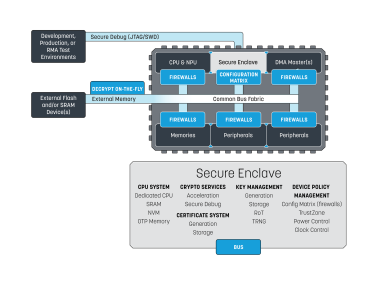 - 2× Octal SPI, each at up to 100 MHz for up to 100 MB/s SDR, 200 MB/s DDR, with Inline AES Decryption, XIP Mode Support, HyperBus Protocol Support, Enabling External Memory Expansion